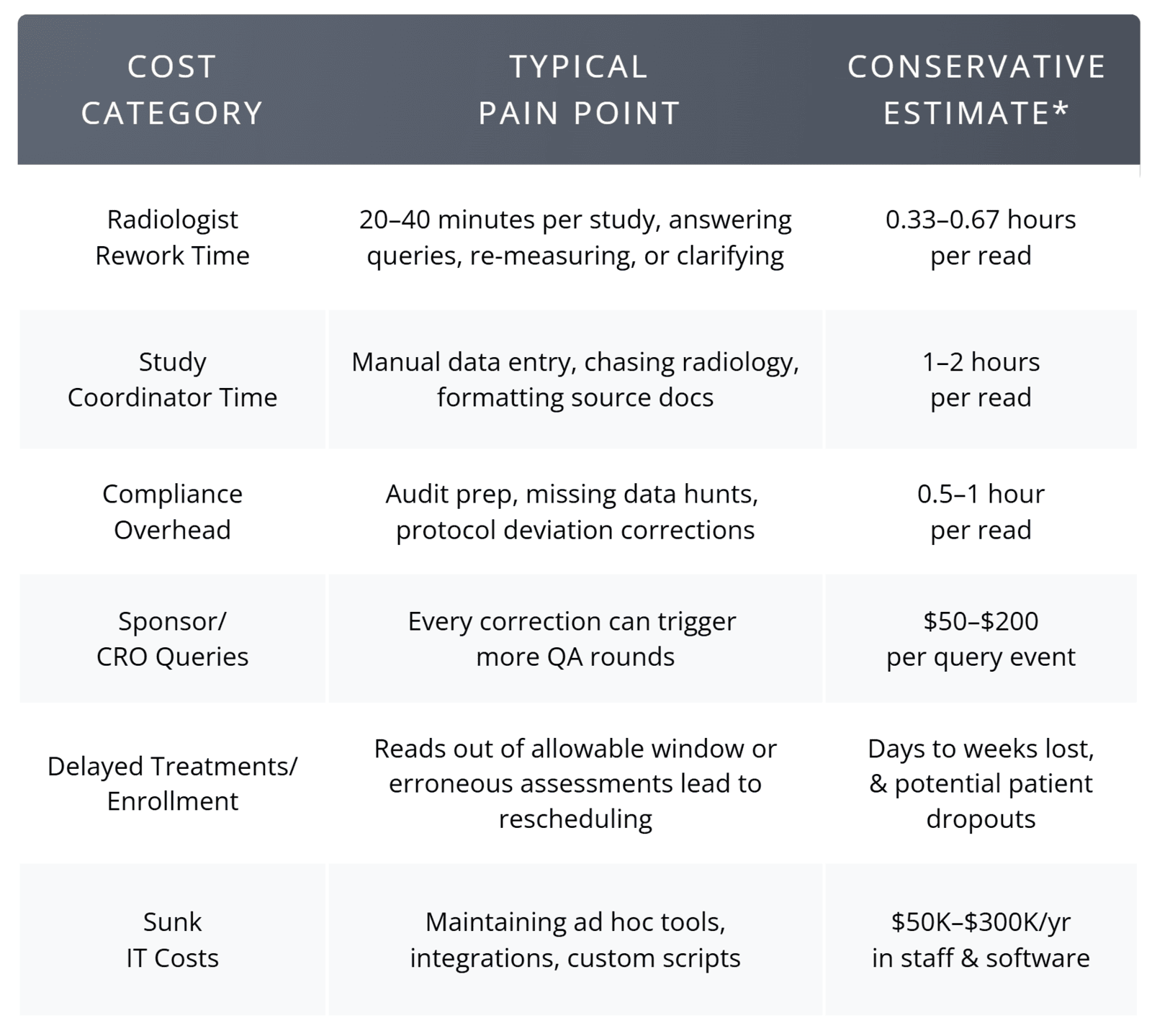 Why it’s wrong: Integration shaves seconds, not hours. Most NCI-designated centers often do <10 research reads/day, and yet the unmanageable workflow makes this a highly disruptive process. Saving 10 seconds per read by “fewer clicks” is meaningless when each read takes 30 minutes due to manual PACS reading processes that trigger 30 more minutes of follow-ups per read to resolve issues. These occur because PACS can’t: