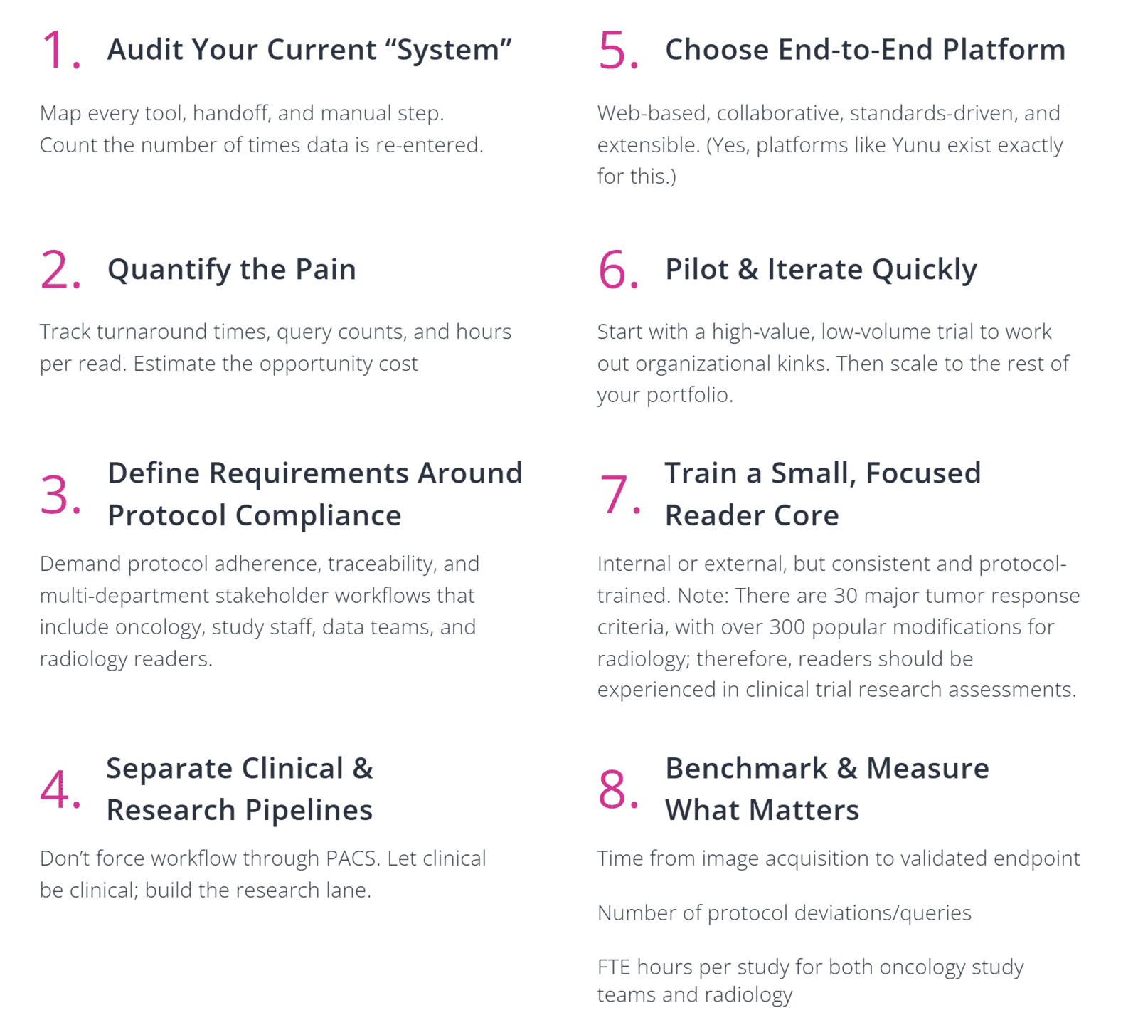 Cancer centers need to stop pretending that a homegrown system with an acronym, or a bolted-on point solution, integrated to the radiology PACS, equals a “system.” What’s required is a purpose-built, end-to-end clinical trials imaging platform that lives on the web, connects investigators, coordinators, and readers, and enforces trial-specific workflows, measurements, and data structures—without forcing everything through radiology’s clinical pipeline. [1,2,6,7]